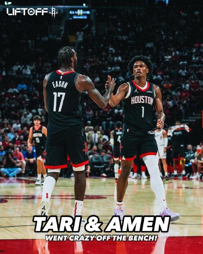 火箭取得3连胜,阿门和伊森成为火箭队史首对在替补席同砍至少15分10板的二东谈主组。
